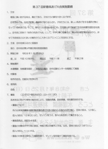 - 審査対象の凧は手作りのものとする。市販の凧は対象外。なお団体の部は二つまで、個人の部は一つまで。