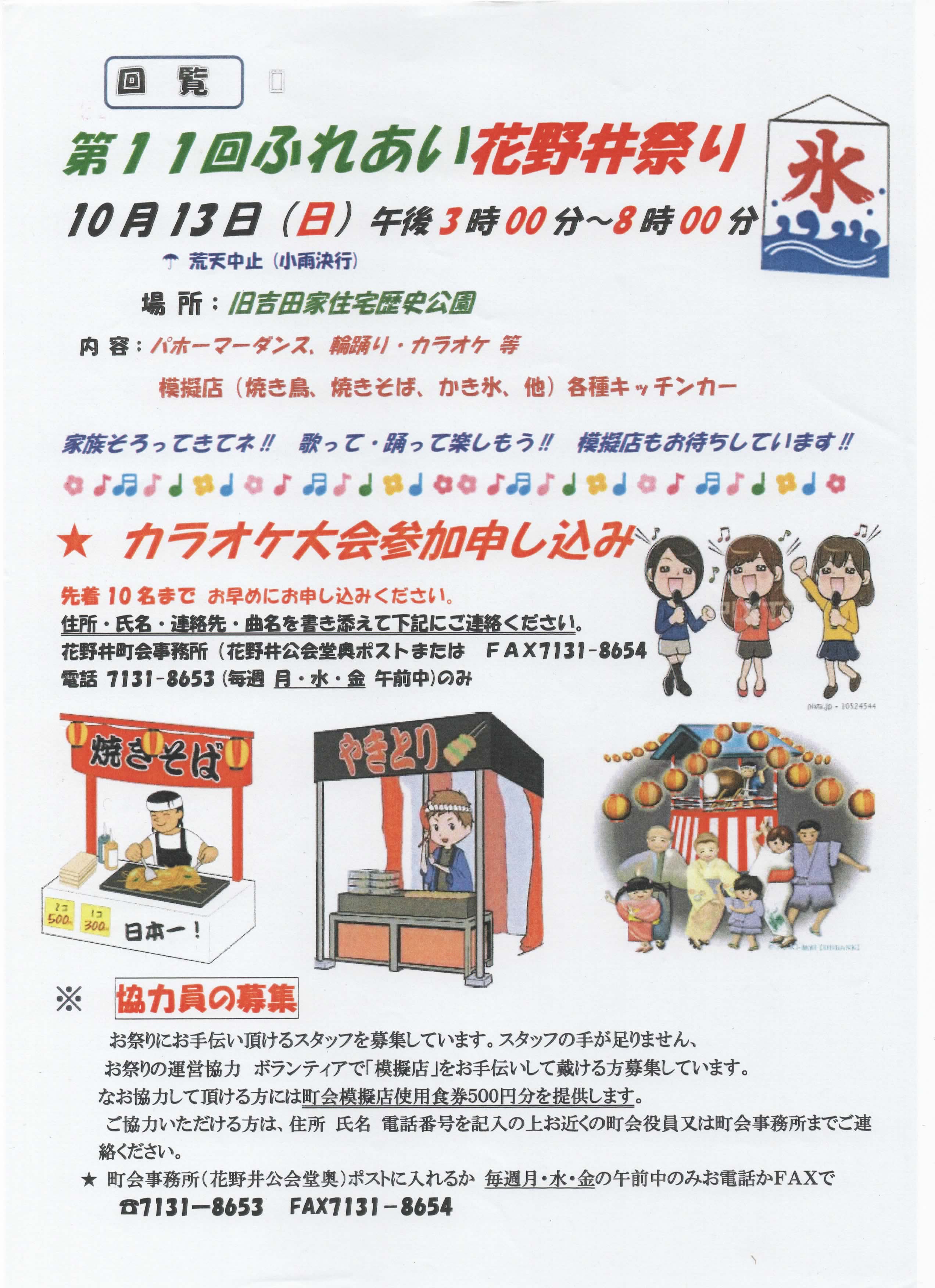 2024.10.02 本日回覧の「第11回ふれあい花野井祭りご案内のお知らせ」を掲載いたします。 2点募集がございます。 ①カラオケ大会の参加者募集申し込み ②ボランティアでお祭り模擬店の運営協力者募集 詳細は案内をご覧ください。 お申込みお待ちしております!