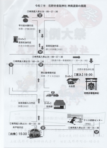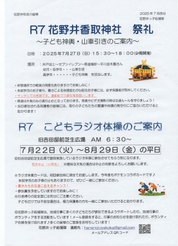 2025.07.23 日時 7月27日(日) 午後3時30分~ コース 江戸坂出発 ~ 平川並木園 折り返し ~ 花野井香取神社 宮入 当日 本神輿・子供神輿 ともに担ぎ手募集中!(詳しくは下記チラシをご覧ください。) 神社への奉納及び寄付は 松丸 までお願いいたします。 主催 花野井香取神社氏子中 協賛 花野井町会・睦会 猛暑が続きますが例年通りの開催になります。 熱中症対策をを行い、ぜひ親子そろって奮ってご参加ください! ジュースやアイスもでるよ!