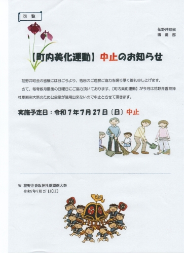 奇数月の隔月に開催しております掲題の日時の町内美化運動を中止といたします。
