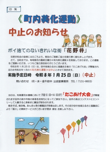 2026.01.12 平素は町会活動にご協力いただきありがとうございます。 毎月、奇数月の最終日曜日に掲題の美化運動を実施しておりますが 同日に田中地域ふるさと協議会主催の凧あげ大会が利根堤防にて開催されます。 花野井町会参加のため令和8年1月の美化運動は中止とさせていただきます。 次回は令和8年3月開催予定です。